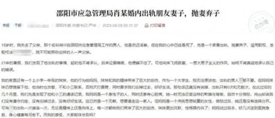 该网友留言,两东谈主离异后,肖某立马和出轨对象走到一谈,在不肯背负妹妹侍奉费的同期,还给妹妹着重“姆妈是坏东谈主”的思法。此外,肖某疑存在铺张权益、败北纳贿的情况。