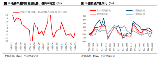 而对于货车、新能源客车、电梯、农机等品类而言,24年以来筹商品类销量尚未达成解析改善。9月货车、电动客车当月同比分别达成-25.7%、+24.3%的增速,自24年以来震撼下行,较8月分别环比下行11.6pct、26.6pct;9月电梯产量同比增速较8月小幅成就9.5pct至-5.7%,但在低基数下同比增速仍看守低位;农机方面,仅微型空泛机产量同比增速于8-9月达成降幅改善,扫尾9月中大型拖机增速仍在震撼下行。