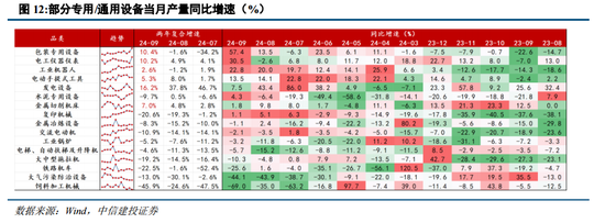 供给端,从几类重心开导的产量弘扬看,包装专用开导、电工仪器姿色、工业机器东谈主等少数细分品类7月以来呈一定程度复苏迹象,但对于其余多数开导而言,产量同比增速尚未见到解析改善,其中发电开导产量同比高位回落,金属冶真金不怕火开导、空泛机、铁路机车、大气混浊防治开导、饲料加工机械开导9月产量同比降幅连续推广,而工业汽锅、疏浚电动机、电梯等范畴产量同比降幅虽有收窄,但仍低位震撼。